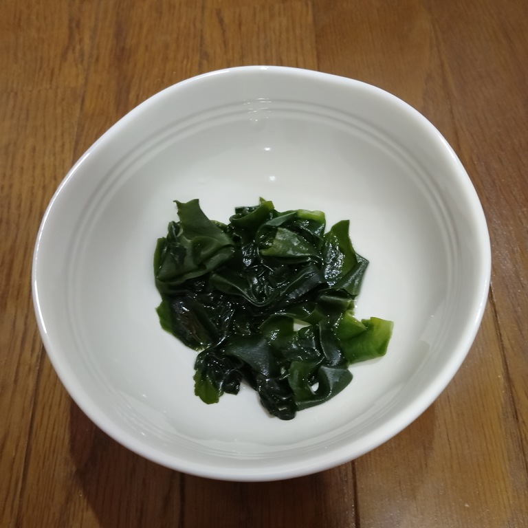 ① 乾燥わかめを水に浸して戻しておく。