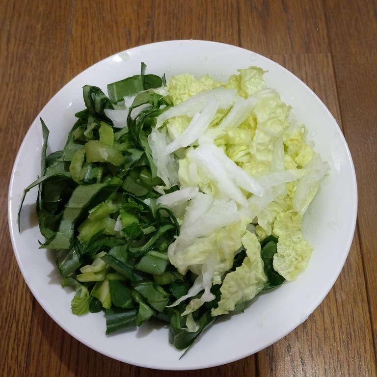 ② 小松菜と白菜を適当な大きさにカットする。