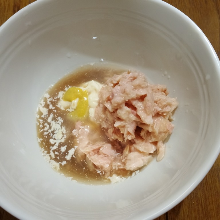 ③ ツナ、マヨネーズ、めんつゆ、からしを混ぜてタレを作る。