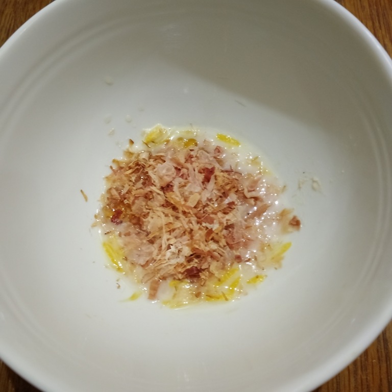 ② 塩こうじ、ごま油、かつお削り節を混ぜ合わせてタレを作る。